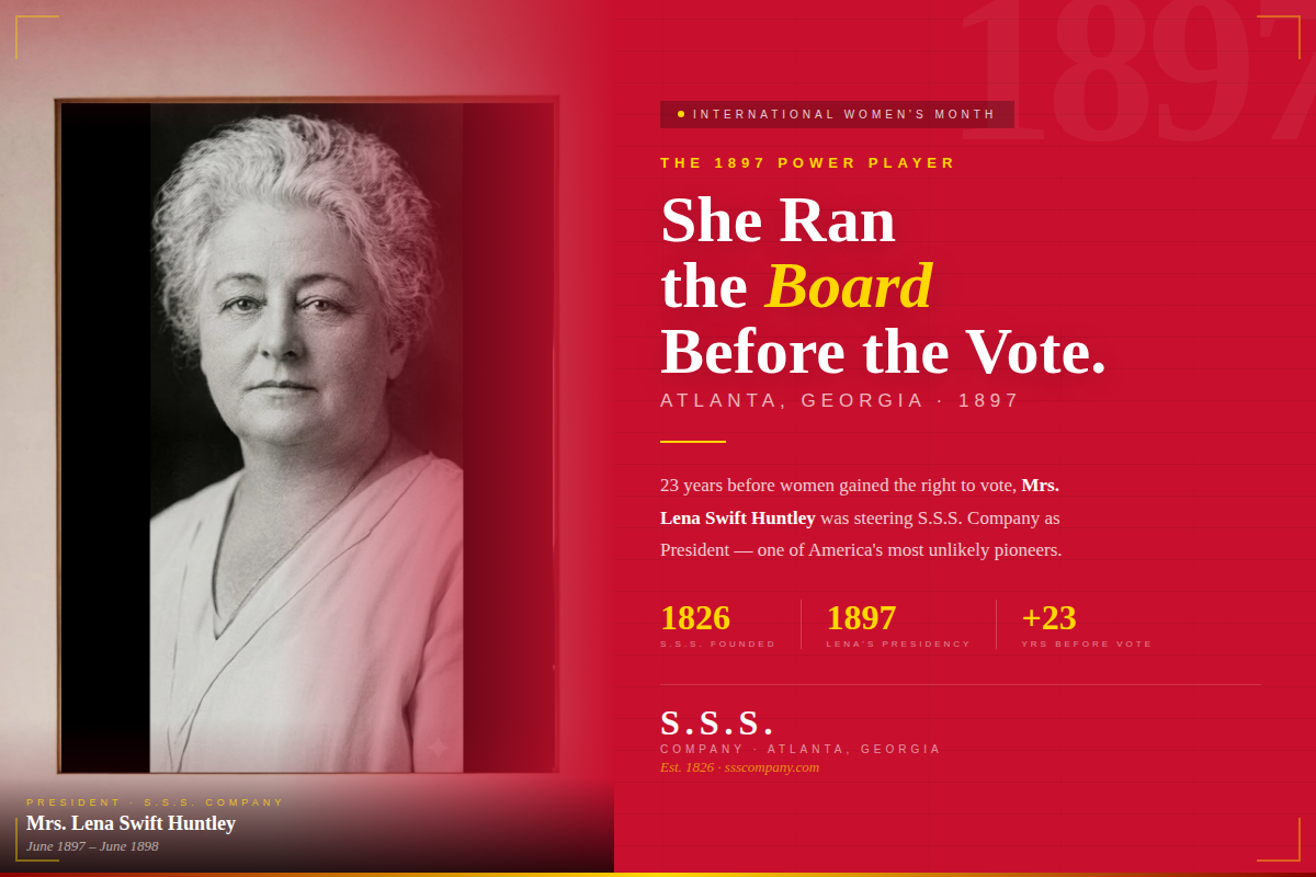 But inside the boardroom of the S.S.S. Company, one woman was making history long before it was allowed. Meet Mrs. Lena Burckhardt Swift Huntley. Known as Mrs. Lena Swift during her first term as President, she became Mrs. Huntley in 1900 after marrying Dr. John Park Huntley, a prominent Atlanta dentist.