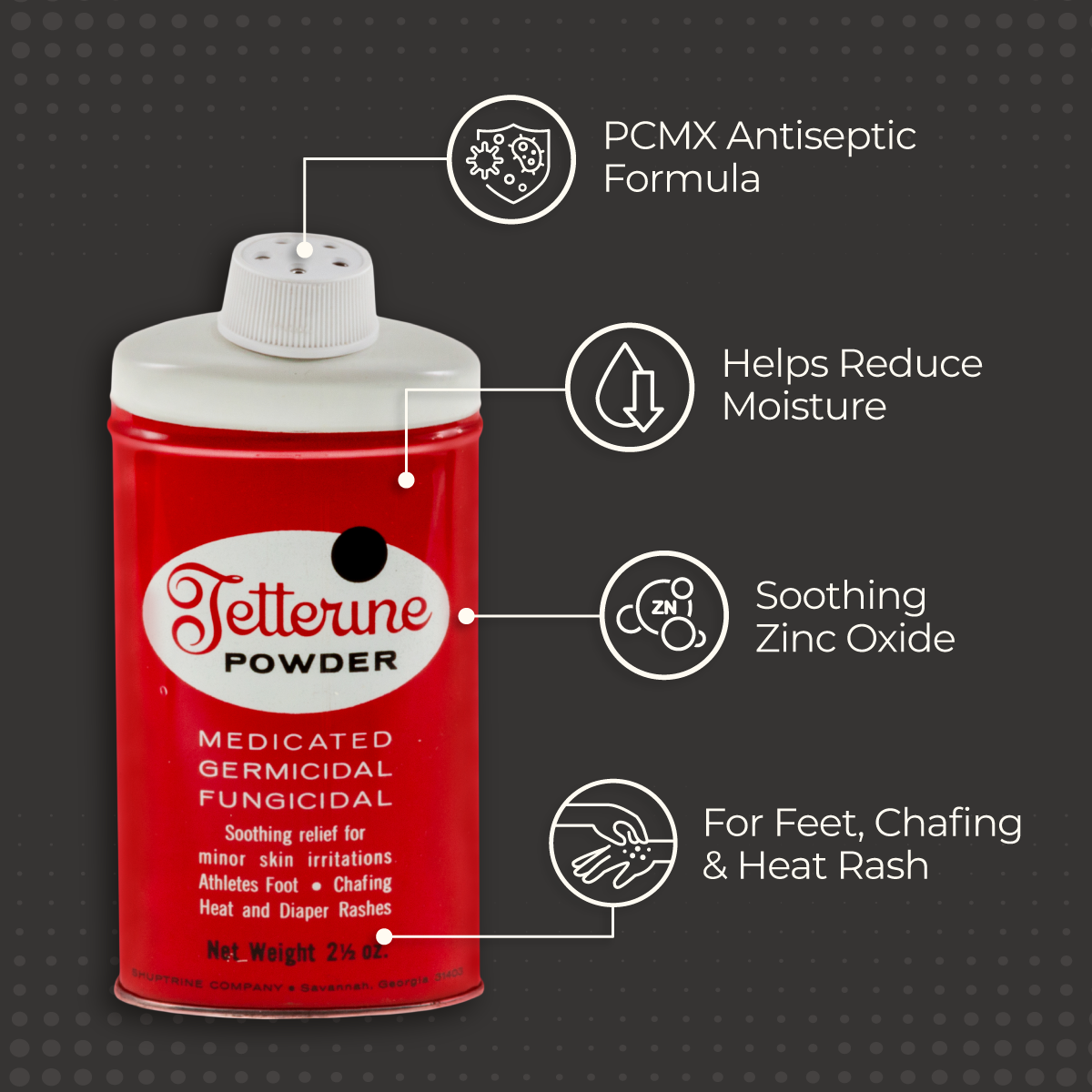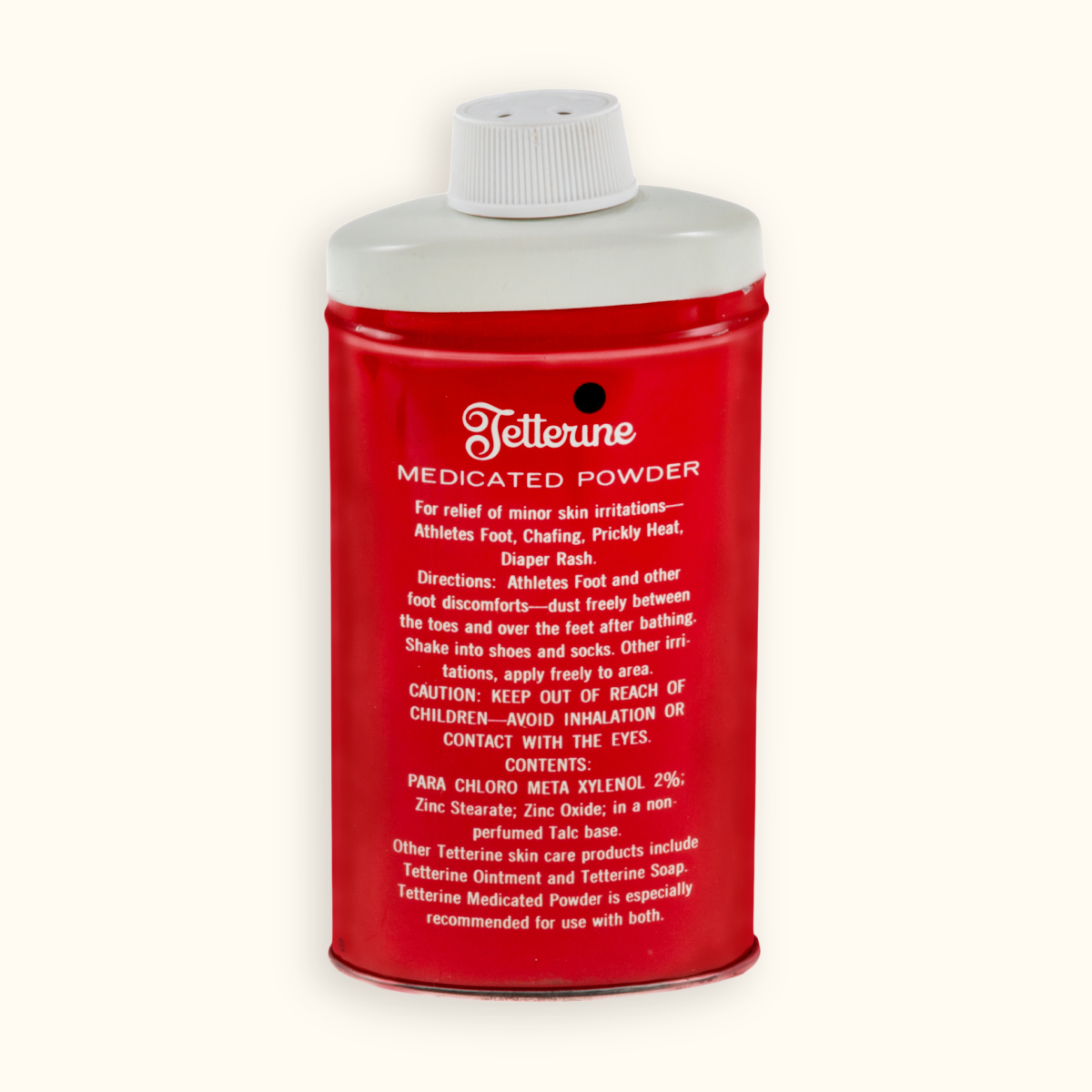 Tetterine Medicated Powder is used to help relieve minor skin irritations such as athlete’s foot, chafing, heat rash, prickly heat, and diaper rash while helping keep skin dry.