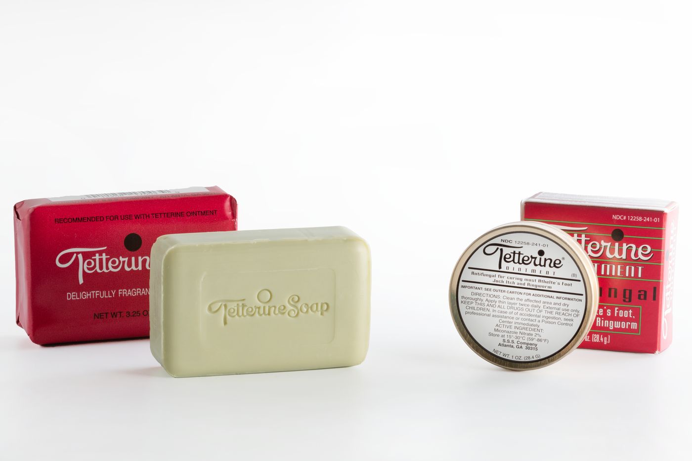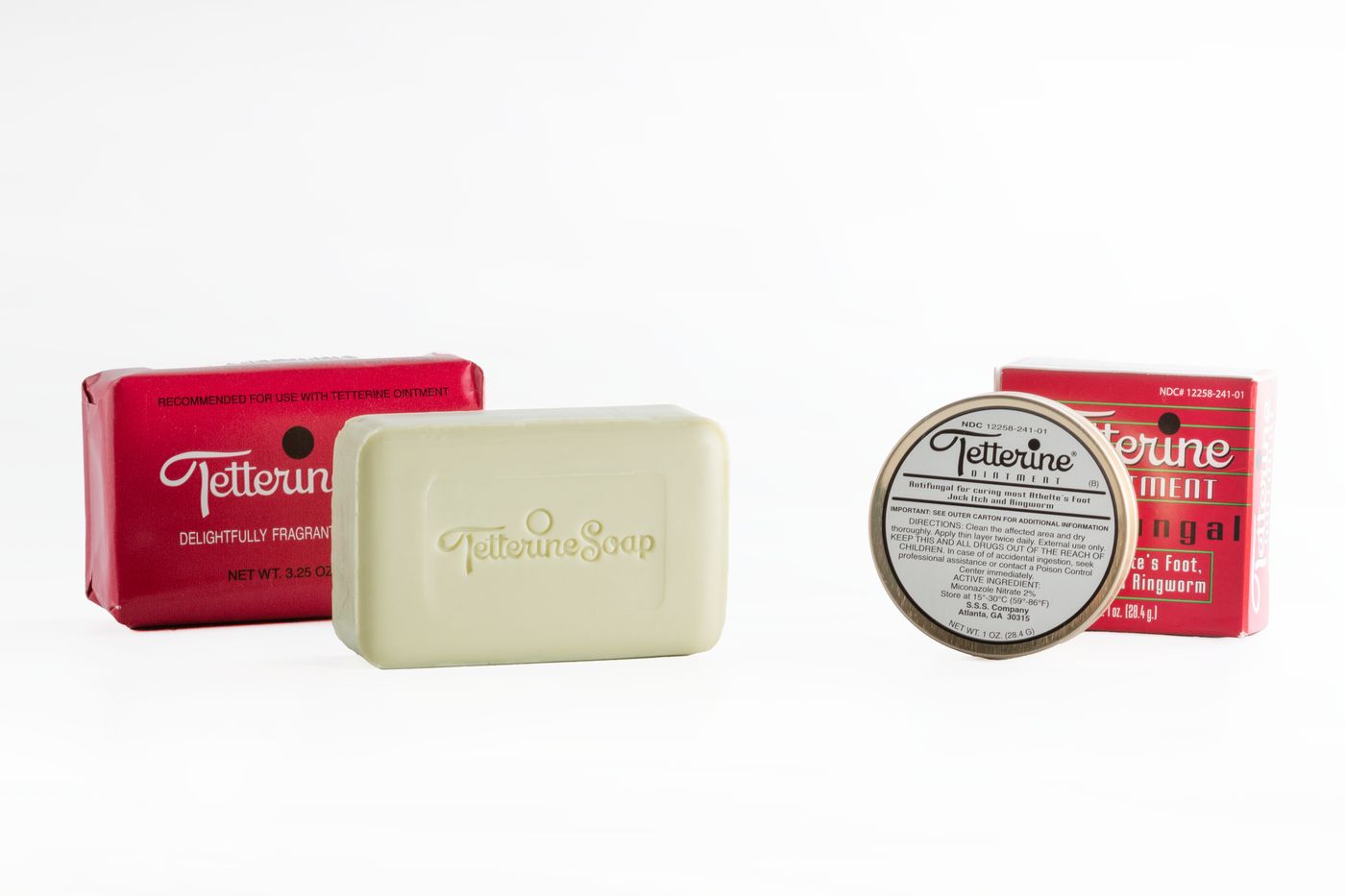 Tetterine Ointment (Green): Miconazole Nitrate 2% w/w (Antifungal), Petrolatum, FD&C Blue #1, Fragrance, Paraffin Wax, Starch. Tetterine Soap: Palm-Based Formula.Warnings: